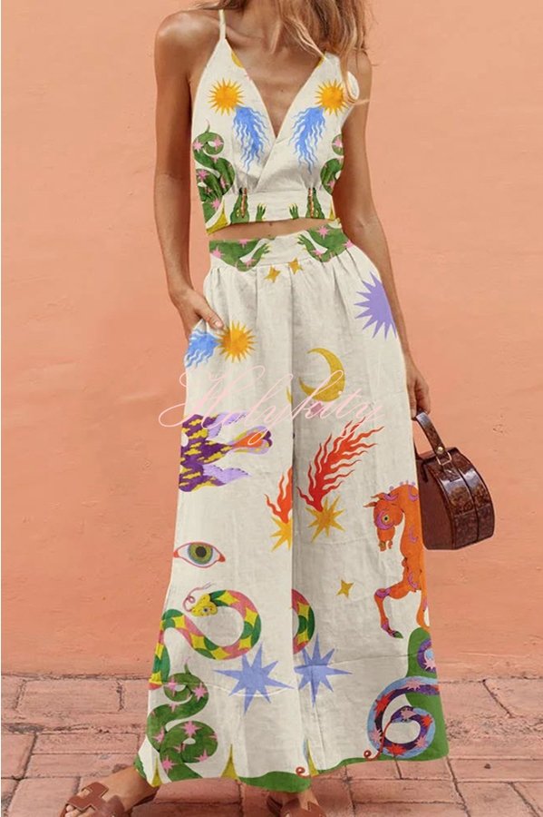 Vacation Charm Linen Blend Unique Print Wrap Cami Top and Elastic Waist Pocketed Pants Set50.000 Ft