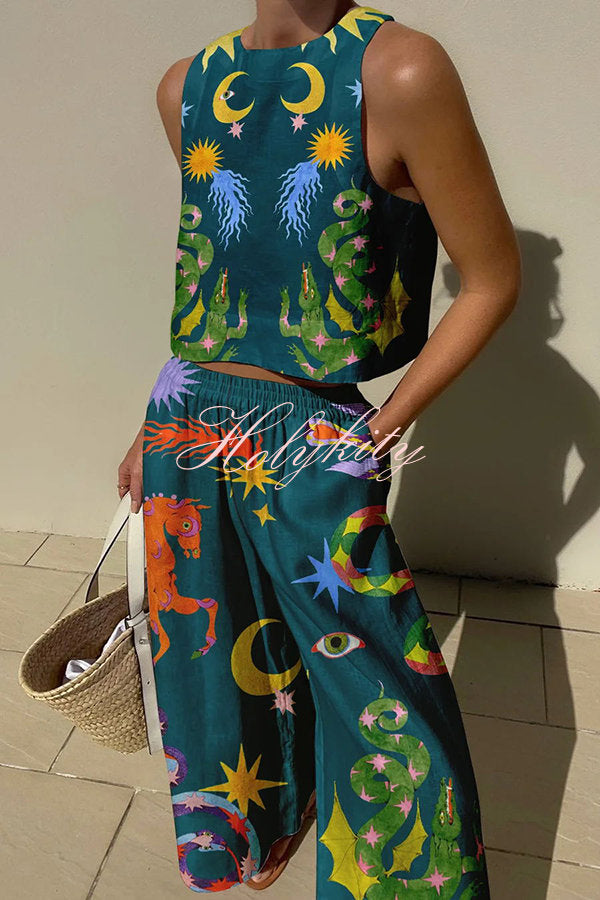 Island Dreaming Linen Blend Unique Print Tank and Elastic Waist Pocketed Pants Set50.000 Ft