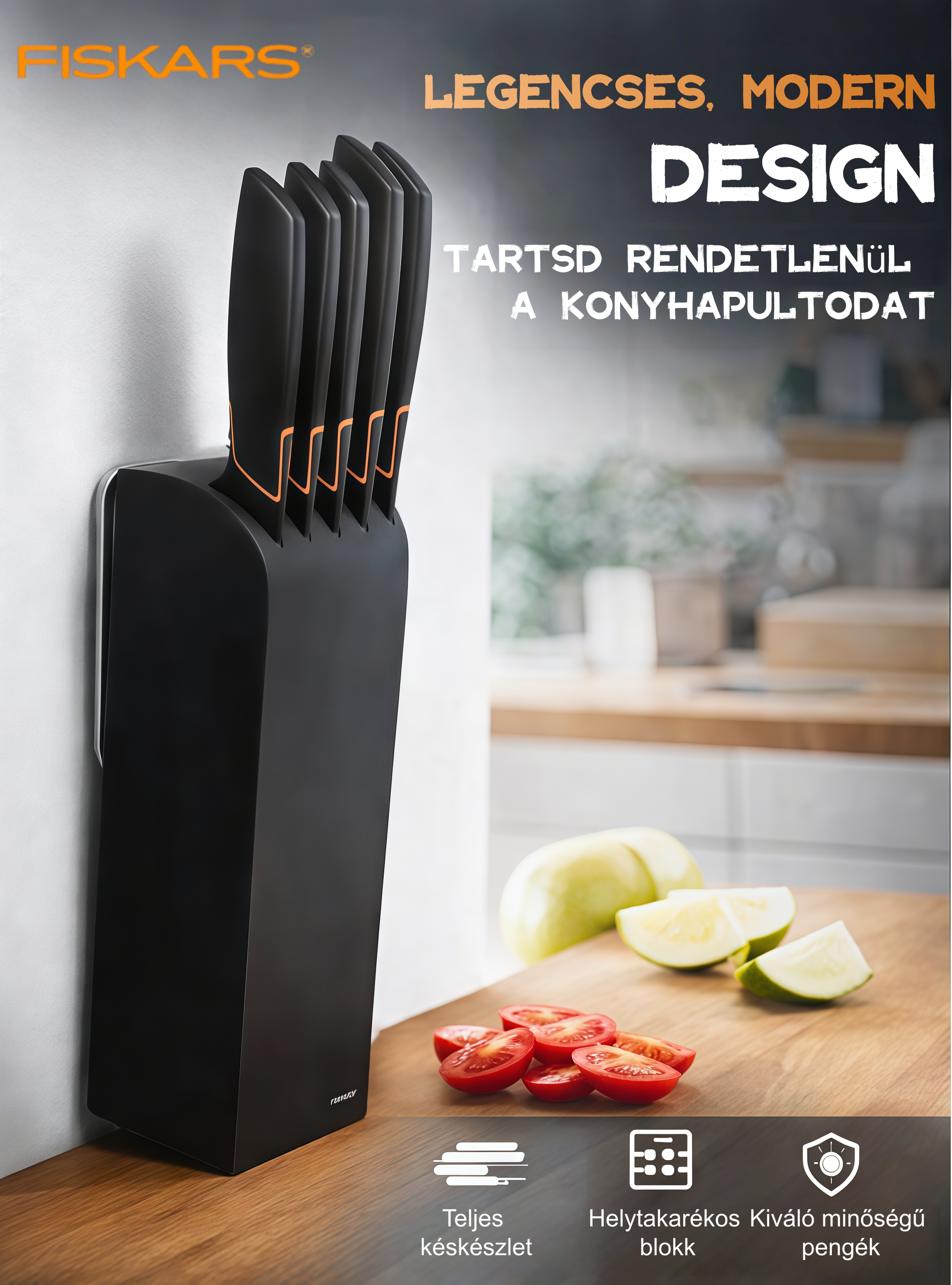 A FISKARS® EDGE késkészlet precízen kovácsolt és hőkezelt, magas széntartalmú japán acélból készült. Rendkívüli élessége és tartóssága miatt a modern konyhák egyik legmegbízhatóbb eszköze.