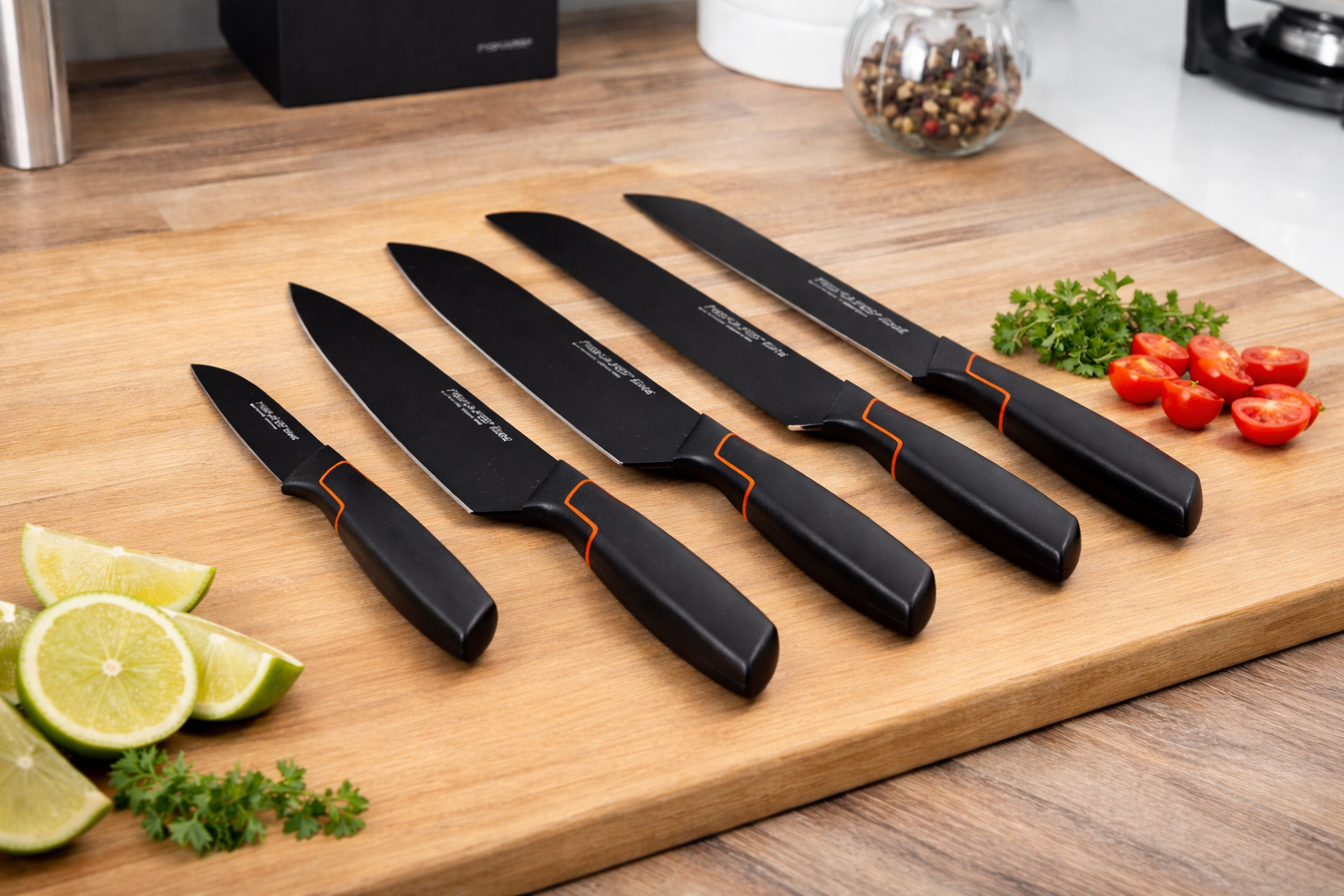 A kések matt fekete felülete letisztult és modern megjelenést kölcsönöz nekik, amely tökéletesen illik bármilyen konyhába. Az ergonomikus nyél biztonságos és kényelmes fogást biztosít használat közben.